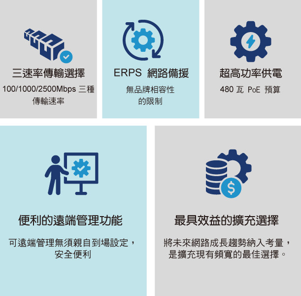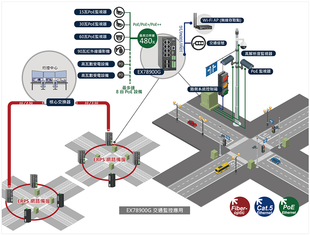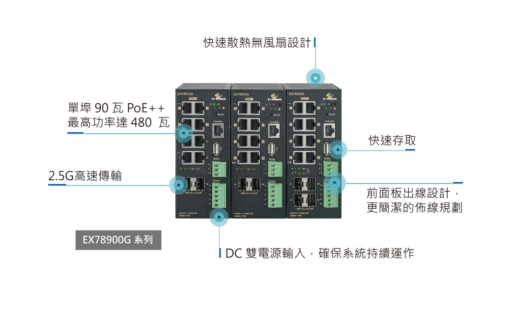 無論是高溫、下雨、潮濕的戶外環境挑戰,或是網路傳輸的穩定性、頻寬與效能要求,提供最即時的影像資訊與互相通訊,並確保基礎設施未來的可擴充性,都是必要考量。採用可靠的工業等級設備,EX78900G 工業級乙太網路交換器可支援達 2.5 G高速傳輸以及 480 瓦超大功率供電量,以及安全可靠的備援機制,將有助於打造了強大的交通網路。
