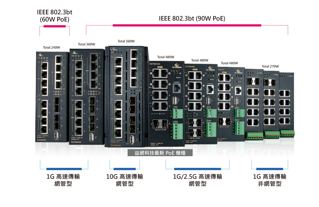 益網科技推出全新 90 瓦高功率 PoE 乙太網路交換器 EX78900G 系列,體積小卻功能強大,可支援網路安裝現場,提供更大幅度供電串接,以及更巨量的傳輸速度,尤其在 AI 應用日漸普及的先進城市中,戶外與路口監控已經採用更高階的監視攝影機,例如,車牌與人臉辨識系統、 PTZ Speed Dome 高解析度攝像機、紅外線攝影機、甚至是用於高緯度低溫地區戶外加熱型攝影機等,並同時需要大量影像數據進行監控與管理。EX78900G 單台即能提供高達 480 瓦的總供電量,為業界所罕見,將更能滿足現場佈建需求。