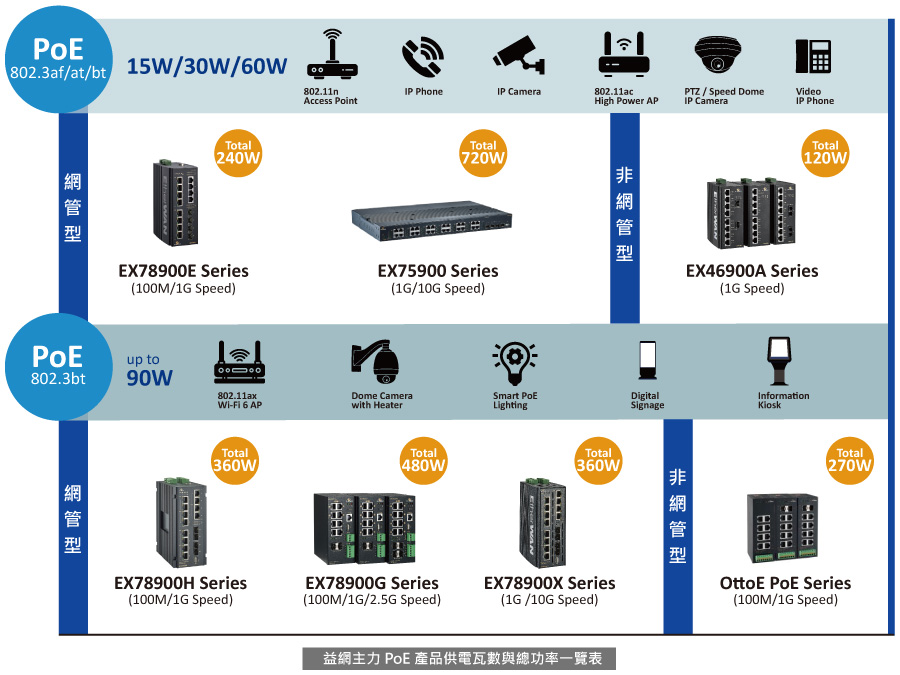 | PoE 供電端所能提供之最大電力 | 15.4 瓦 | 30 瓦 | 60 瓦 | 90 瓦 |